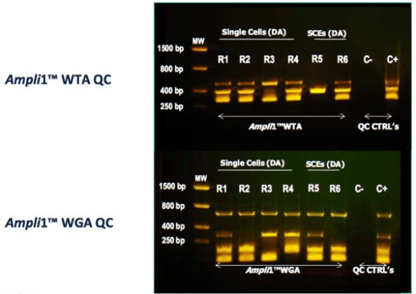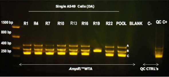 High quality WTA products produce three PCR amplicons of 489, 378, and 290 base pairs, as seen in the image below showing Ampli1™ WTA QC Kit analysis of single A549 cell transcriptomes amplified by the Ampli1™ WTA Kit: