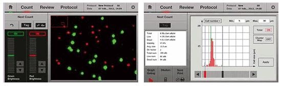 Cells can be gated based on cell size. you can easily exclude or include the particles by simply dragging the ends of the histogram that graphically shows live and dead cell populations.