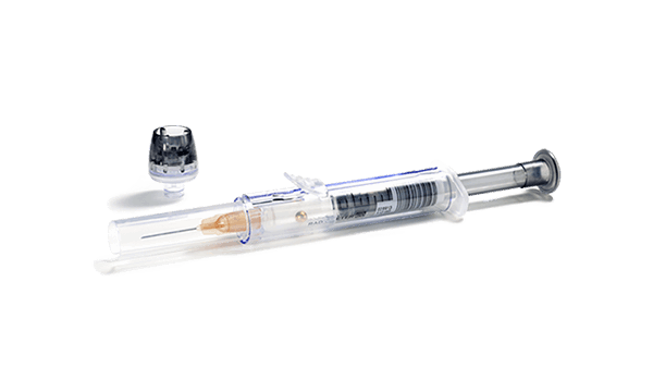 The integrated needle shield device on the safePICO self-fill syringe lowers the risk of needlestick injury.