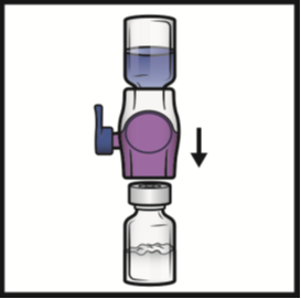 8. Turn the system over so that the diluent vial is on top. Quickly insert the purple