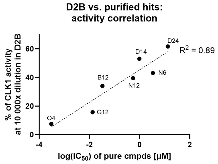 - Strong (0.89 R2) correlation between D2B crude activity and purified IC50 ranking