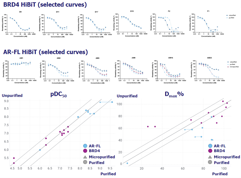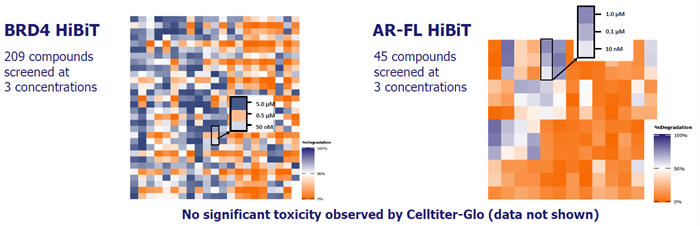 - Single-point % degradation and DC50 values can be generated in a multiplex assay that simultaneously measures degradation and cytotoxicity, reducing timelines and saving resources and costs.