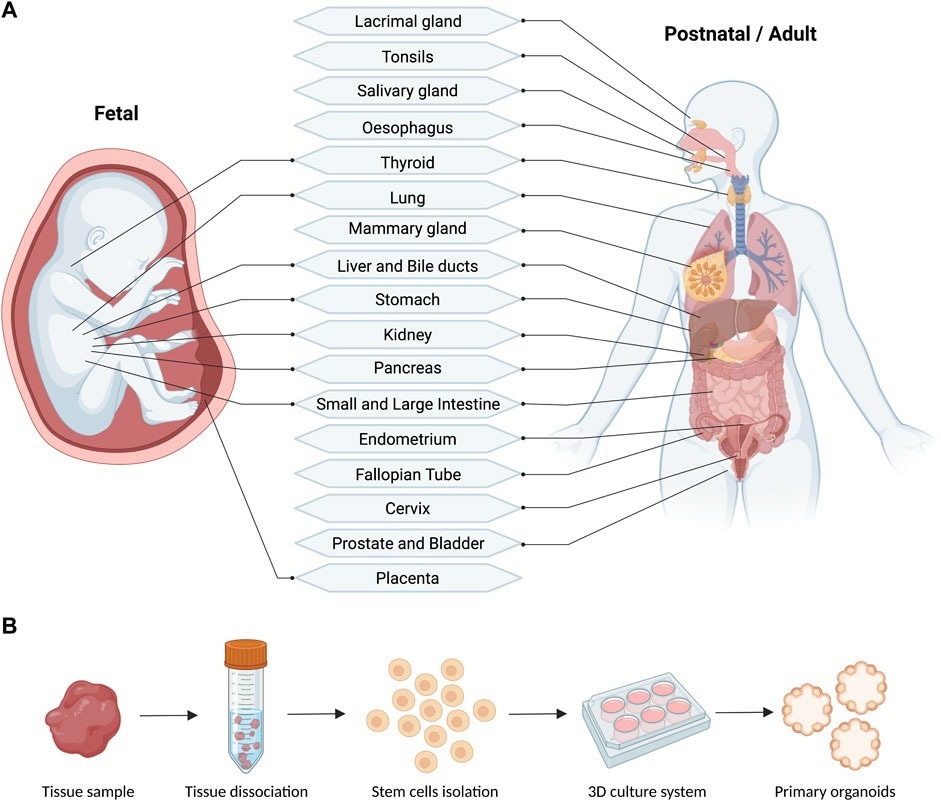 Schematic (A) and workflow (B) of the reported fetal and postnatal/adult tissues used for the derivation of primary human organoids (generated with BioRender).2