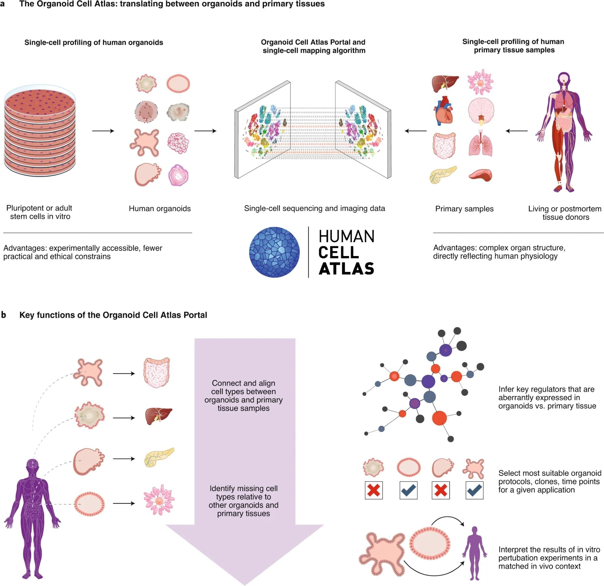 a, Single-cell profiling of human organoids (left) and of human primary tissue samples (right) provides complementary information. Data integration between single-cell profiles from organoids and primary tissues makes it possible to investigate the same cell type in both contexts, allowing each approach to play to its strengths. b, The Organoid Cell Atlas Portal will implement key features for analyzing and interpreting single-cell data from human organoids in the biological context provided by HCA profiles of their in vivo counterparts. 10