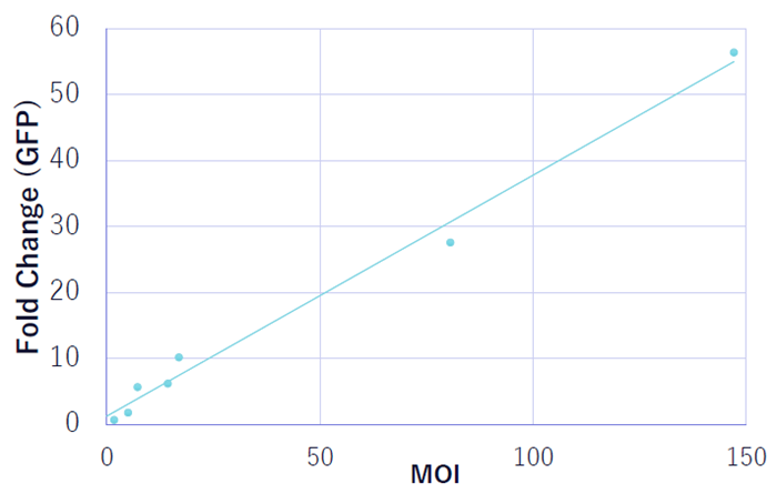 Figure 3. Fold change and linear regression fit (R2 = 0.9895) in GFP expression in MCF7 cells transduced with LV of different MOIs. A clear positive and near-linear relationship between MOI and GFP expression is observed. Image Credit: Image courtesy of T Duboys et al., in partnership with ELRIG (UK) Ltd.