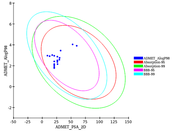 Fig 4. ALogP versus polar surface area (PSA) plot for compounds showing the 95 % and 99 % confidence. Image Credit: Image courtesy of Sarona Jacob Anderson et al., in partnership with ELRIG (UK) Ltd.