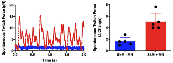 Myomaker organ 2: Spontaneous twitch in muscle organs with iPSC motor neurons (red) and without (blue). Inhibition of acetylcholine receptor in spontaneously contracting neuromuscular tissues demonstrated with the addition of d-Tubocurarine. Image Credit: Myomaker Bio