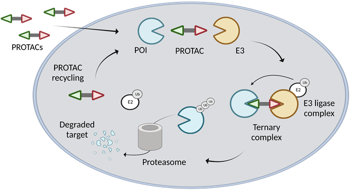 PROTACs are heterobifunctional molecules that bind to a protein of interest (POI) and an E3 ligase, causing the POI to be degraded by the ubiquitin-proteasome system (UPS) (Figure 1).