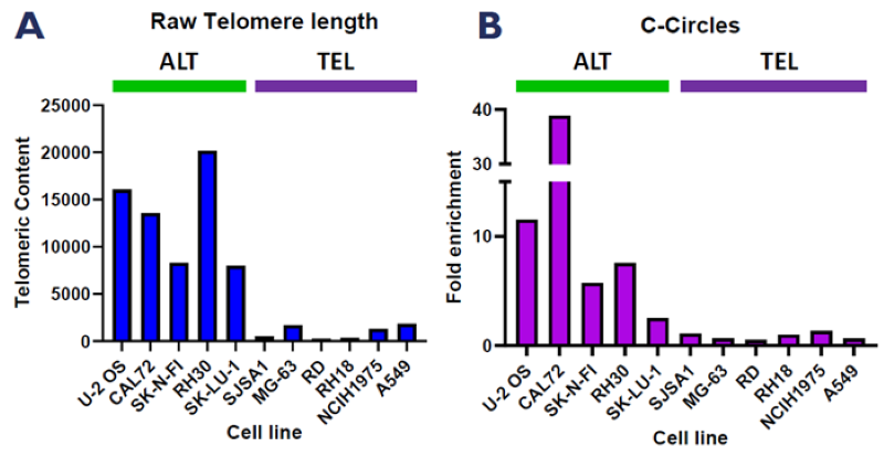 Osteosarcoma models feature heavily in the ALT literature due to the high prevalence of ALT in clinical samples from this lineage and the availability and amenability of these cell lines to in vitro manipulation. The team used the CCA-qPCR and ssTelo native FISH assays to validate a panel of osteosarcoma cell lines for ALT or TEL status based on the presence or absence of the ALT hallmarks.