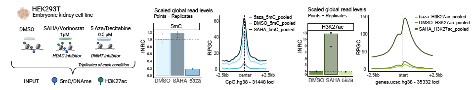 Left: Experimental setup: HEK293T cells treated with SAHA or 5-Aza (+DMSO control); triplicates of each pooled and processed. Center: 5-Aza, DNMT inhibitor reduces global DNA methylation (5mC)5mC, especially at CpG islands. Right: SAHA, HDAC inhibitor increases global H3K27ac and enrichment at TSSs. Image Credit: Image courtesy of Banushee Kumar et al., in partnership with ELRIG (UK) Ltd.