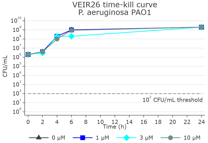 Figure 2. (Table) MIC values for VEI-0026 and common antibiotics. An MIC was not obtained for VEI-0026 at any tested concentration. (Graph) VEI-0026 does not inhibit the growth of P. aeruginosa at concentrations 10x higher than swarming EC100; prevention of swarming is not a result of cytotoxicity but selective disruption to c-di-GMP signalling. Image Credit: Image courtesy of Rory Triniman et al., in partnership with ELRIG (UK) Ltd.