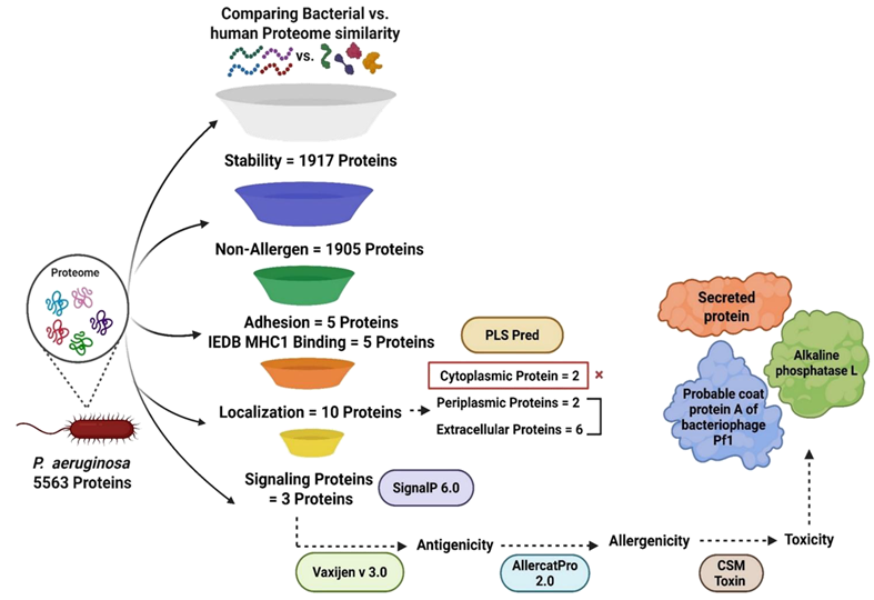 The researchers have screened the full proteome (5,563 proteins) to identify non-human homologous, stable, non-allergenic, adhesive, and immunogenic proteins. Furthermore, shortlisted proteins (Probable coat protein A of bacteriophage Pf1, alkaline phosphatase L, and a secreted protein) were evaluated for B-cell, CTL, and HTL epitopes.