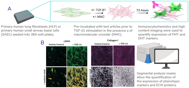 Figure 1. High throughput assay setup. A) Schematic outlining the process of FMT and EMT assays. B) Representative images showing the segmental analysis masks used for quantification of markers. Examples shown: α-smooth muscle actin (α-SMA) and collagen I. Image Credit: Newcells Biotech