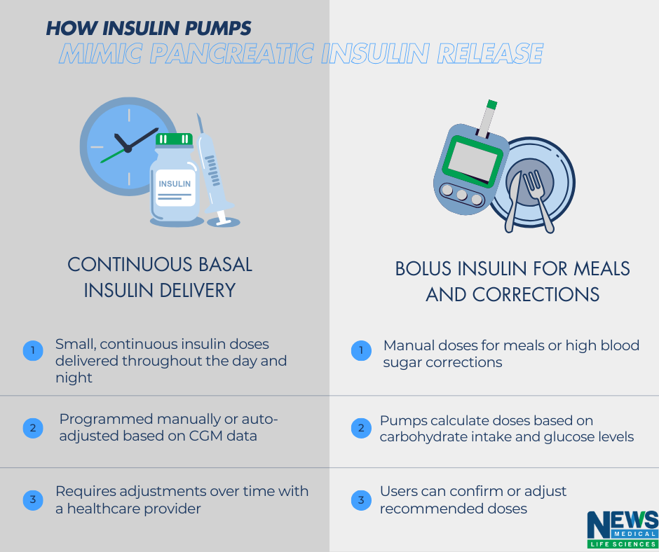 Insulin pumps mimic the way the pancreas naturally releases insulin in two different ways.5