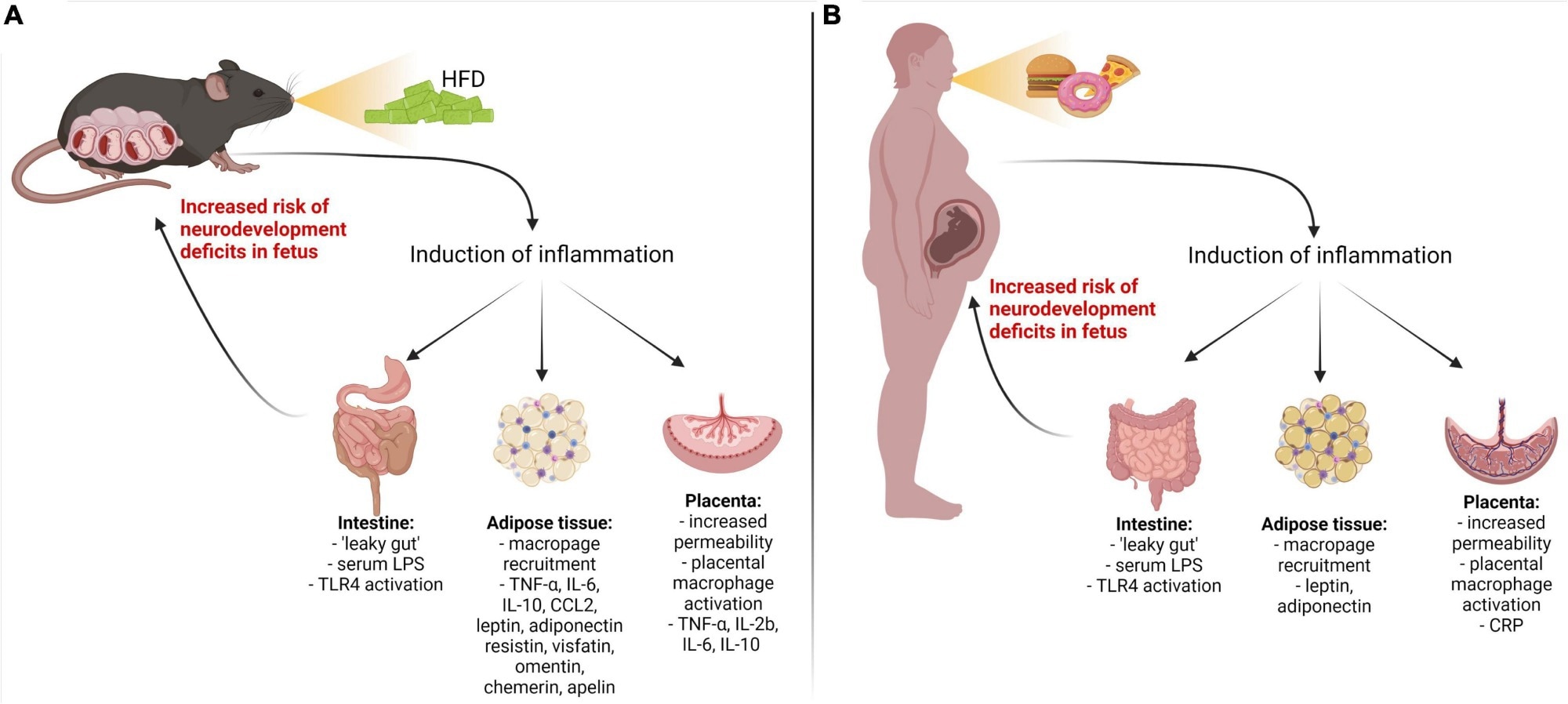 Inflammatory pathways are activated by a maternal high-fat diet-induced metabolic disease. Metabolic disorders in pregnant mouse dams (A) and women (B) result in the upregulation of pro-inflammatory cytokines/adipokines through the gut, adipose, and placental pathways. LPS, lipopolysaccharide; TLR4, Toll-like receptor 4; IL-1β, IL-6, IL-8, IL-17a – interleukins 1 beta, 6, 8, 17a; TNF-α, tumor necrosis factor-alpha; CRP, C-reactive protein; CCL2, chemokine (C–C motif) ligand; IFN-γ, interferon-gamma.8