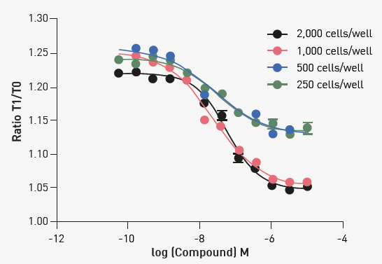 The optimization of the endpoint readout version of this assay began with understanding the effect of cell numbers. The initial assessments shown in Figure 2 were performed at the five-minute time point.