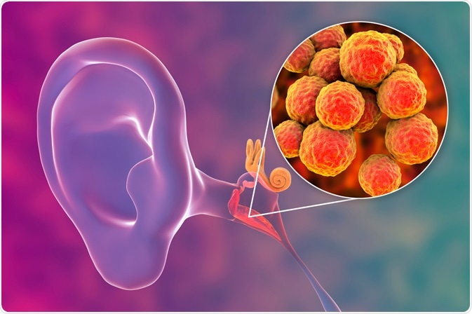 Chronis suppurative otitis media involves a bacterial infection of the middle-ear that persists for several weeks or longer and is accompanied by a hole in the tympanic membrane. The pus may accumulate and drain outside the ear, although it may also only be visible on inspection with an otoscope or binocular microscope. This condition is more common in individuals with poor Eustachian tube function and often precipitates hearing impairment.