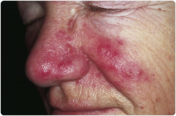 Rosacea is typically characterized by a redness and discoloration across the face, accompanied by persistent red spots and the appearance of prominent blood vessels. Over time, the skin may thicken and enlarge and eventually cause facial deformity.