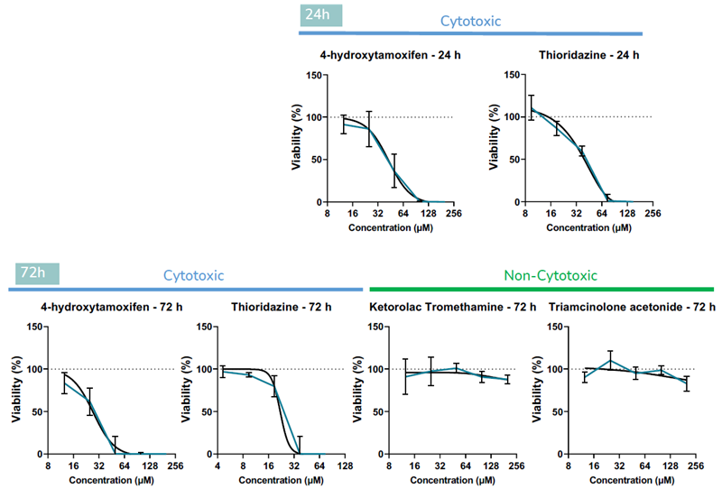 B. Retinal organoids were treated with known retinotoxins (4- hydroxytamoxifen and thioridazine), and agents known to be non-toxic to retina in vivo (ketorolac and triamcinolone acetonide) across a range of concentrations. Viability assays demonstrated that organoids respond to the compounds in a predictive doseresponse manner after 24 and 72 h of incubation. Data is presented as mean ± SD (N≥4). Image Credit: Newcells Biotech