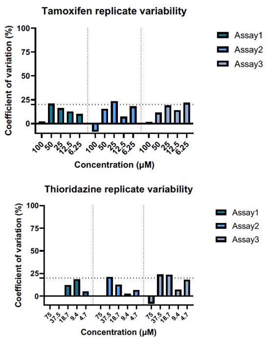 C. Organoid viability experiments were repeated across batches to demonstrate result consistency. The coefficient of variation was calculated by dividing the standard deviation (SD) by the replicate mean, and multiplied X100. Coefficient of variation % ≤ 20 % indicates good assay reproducibility. Image Credit: Newcells Biotech