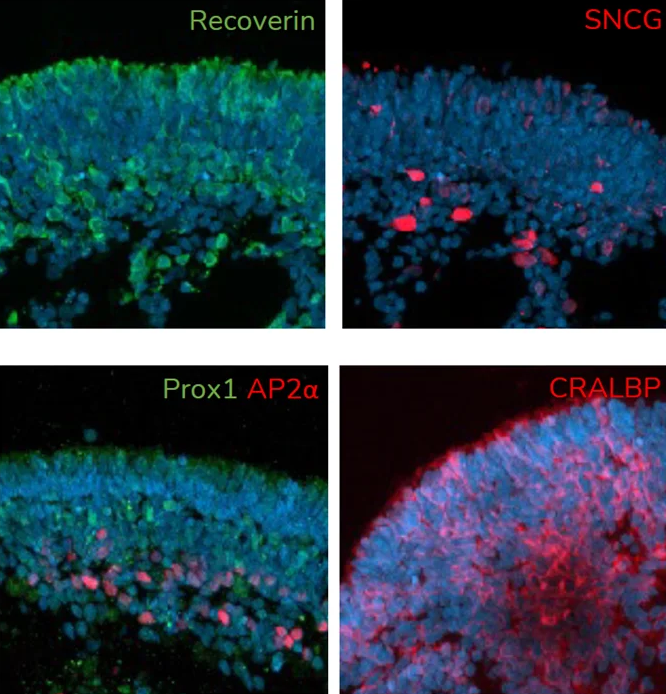 A. At day 150 of differentiation, retinal organoids contain major retinal cell types, including photoreceptors (Recoverin), retinal ganglion cells (SNCG), amacrine cells (AP2α), horizontal cells (Prox1) and Muller glia (CRALBP). Image Credit: Newcells Biotech