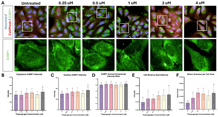 Figure 2. Thapsigargin- and sorbitol-induced stress response in U-2 OS. U-2 OS cells were treated with (A) 0.25 μM – 4 μM thapsigargin for 2 hours, or (B) 50 mM - 400 mM sorbitol for 1 hour, and immunolabelled for G3BP1 (green) and dyed with Hoechst (blue) and CellMask (red) (scale bars = 100 μM). Thapsigargin did not induce a consistent stress response, as evidenced in quantification of (C) G3BP1 intensity in the cytoplasm, (D) G3BP1 intensity in the nucleus, (E) G3BP1 nuclear/cytoplasmic intensity ratio, (F) relative G3BP1 spot intensity, and (G) G3BP1 spot count per cytoplasm area. Stress granule formation was induced with 400 mM sorbitol, as shown in quantification of (H) G3BP1 bright spot count, (I) G3BP1 spot count per cytoplasm area, (J) G3BP1 spot contrast, and (K) relative G3BP1 spot intensity. Statistical analysis: one-way ANOVA with Dunnett’s multiple comparisons test (* = p< 0.05, ** = p< 0.01, **** = p< 0.0001). Image Credit: Image courtesy of Daisy Maiden et al., in partnership with ELRIG (UK) Ltd.
