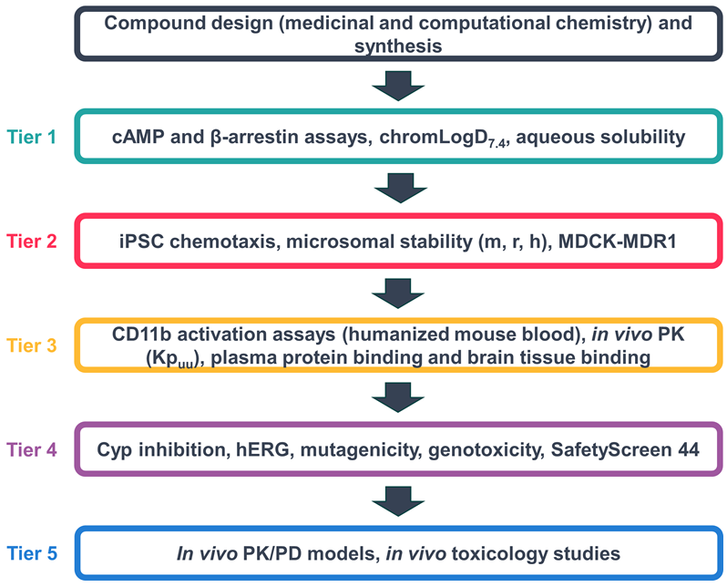 A five-tier screening cascade suitable for testing novel compounds has been developed. These were designed through robust SAR analysis and further validated using computational chemistry efforts, followed by pharmacological validation as C5aR1 NAMs via a series of assays utilizing a range of recombinant, hiPSC, and ex vivo models.