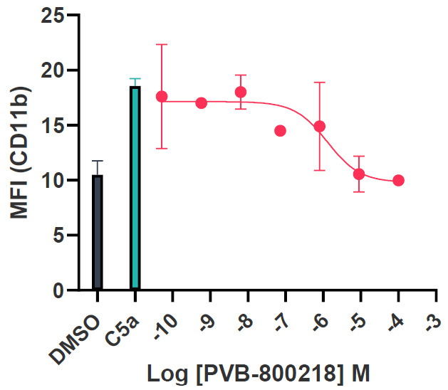 The C5aR1 allosteric site is not present in the mouse isoform. Thus, a humanized mouse model was developed. To validate this model, initial data identified the ability of the compounds to inhibit C5a-induced neutrophil activation (reduced CD11b expression) as well as reducing the expression of Ly6G, a marker of chemotactic cells, confirming the chemotaxis data with hiPSC microglia.