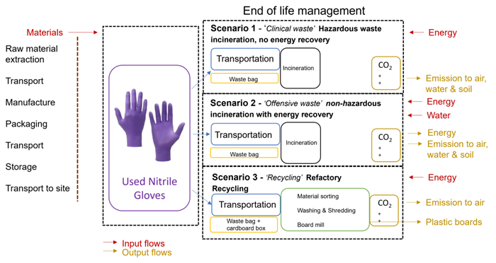 System boundary for LCA to compare end-of-life options for Nitrile gloves used in scientific research. Image Credit: Image courtesy of Jasmine Abdy et al., in partnership with ELRIG (UK) Ltd.
