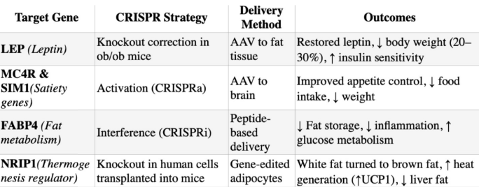 - CRISPR-based therapies may provide durable, specific, and long-term interventions for obesity.