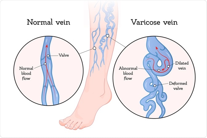 When these valves are damaged by infection, or disease, or as the result of too much and prolonged pressure on them, blood leaks back through them. This causes blood to collect in the part of the vein that is below the valve.