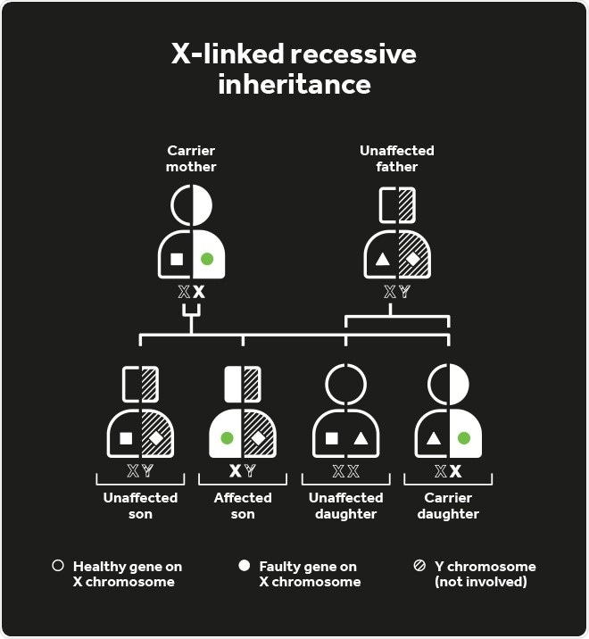 Female carriers are usually unaffected, but some do experience symptoms of night blindness later in life with some patchy loss in vision. This occurs because despite women having two X-chromosomes, one is switched off in every cell to ensure the correct amount of gene product (protein) is being produced.