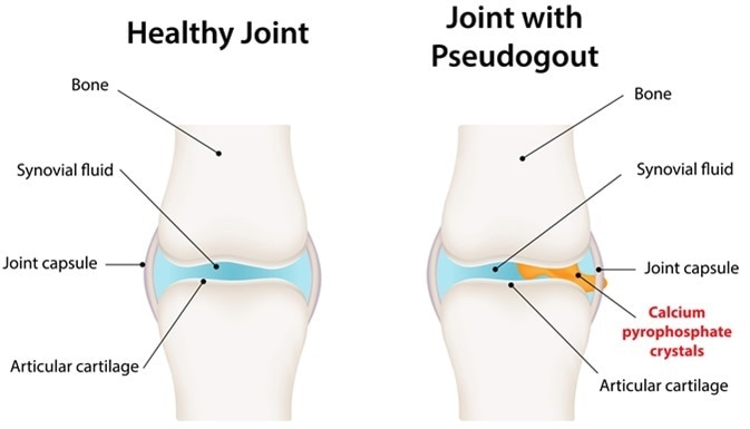It is not clear why the calcium pyrophosphate crystals form, and not everyone who develops crystals in their joints will experience pain or swelling. Painful ‘attacks’ of pseudogout may be due to the release of calcium pyrophosphate crystals into the joint fluid, attracting white blood cells.