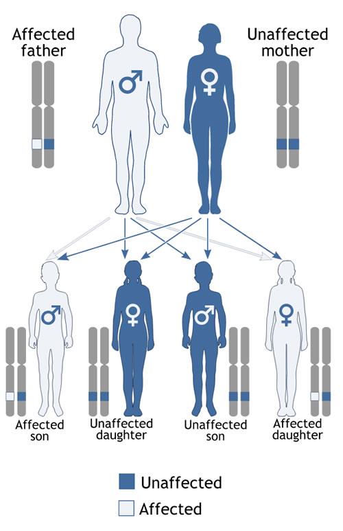 Sometimes the inherited gene is a dominant one. This means if a person carries even one copy of that gene, he or she is likely to develop the trait. In some dominant conditions, it is possible to inherit an altered gene without showing any signs of the condition: in other words, the gene is not fully penetrant. Examples of genetic conditions that are inherited in a dominant way are Huntington’s disease and Neurofibromatosis type 1 (NF1).