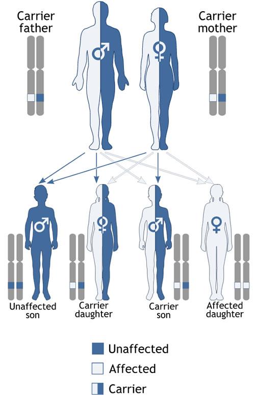 Haemophilia and Duchenne muscular dystrophy as well as red-green colour blindness is inherited this way.