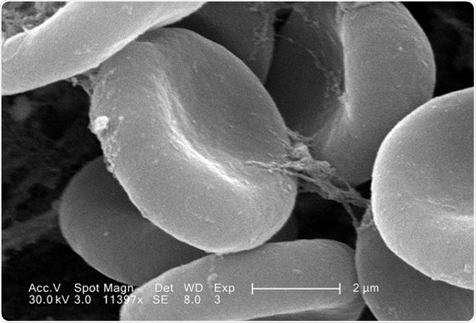 The image shows red blood cells, taken using a scanning electron microscpe.