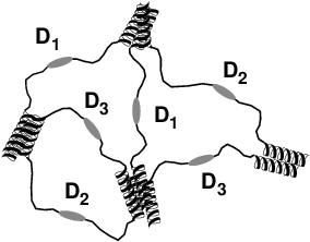The Harden lab's new hydrogel is made by mixing specially designed modular proteins in a buffered water solution. Each protein consists of a flexible central coil, containing a bioactive sequence and flanked by helical associating modules on each end. These end-modules come in three distinct types, which are designed to attract each other and form three-member bundles. This bundling leads to the formation of a regular network structure of proteins with three-member junctions linked together by the flexible coil modules. In this way, the new biomaterial assembles itself spontaneously when the protein elements are added to the solution.