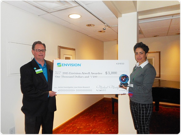 Michael Epp, Director of Professional Education at Envision, presents the 2015 Envision-Atwell Award for research in low vision to Pamela Jeter, Ph.D., a Postdoctoral Research Fellow at the Wilmer Eye Institute at Johns Hopkins University in Baltimore. Dr. Jeter’s research abstract, “Yoga Increases the Sensory Contribution to Balance in Visually Impaired Persons at Risk for Falls,” summarized her evaluation of the therapeutic benefits of yoga for individuals who experience balance deficits and psychological distress due to vision loss.