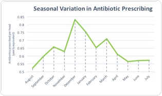 Antibiotic prescribing, seasonal variations: August 2014 to July 2015. Source: EXASOL