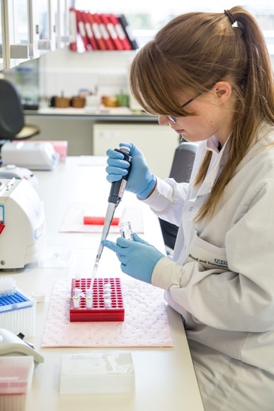 Laura Johnson working in NHS Blood and Transplant's International Blood Group Reference Laboratory in Filton.