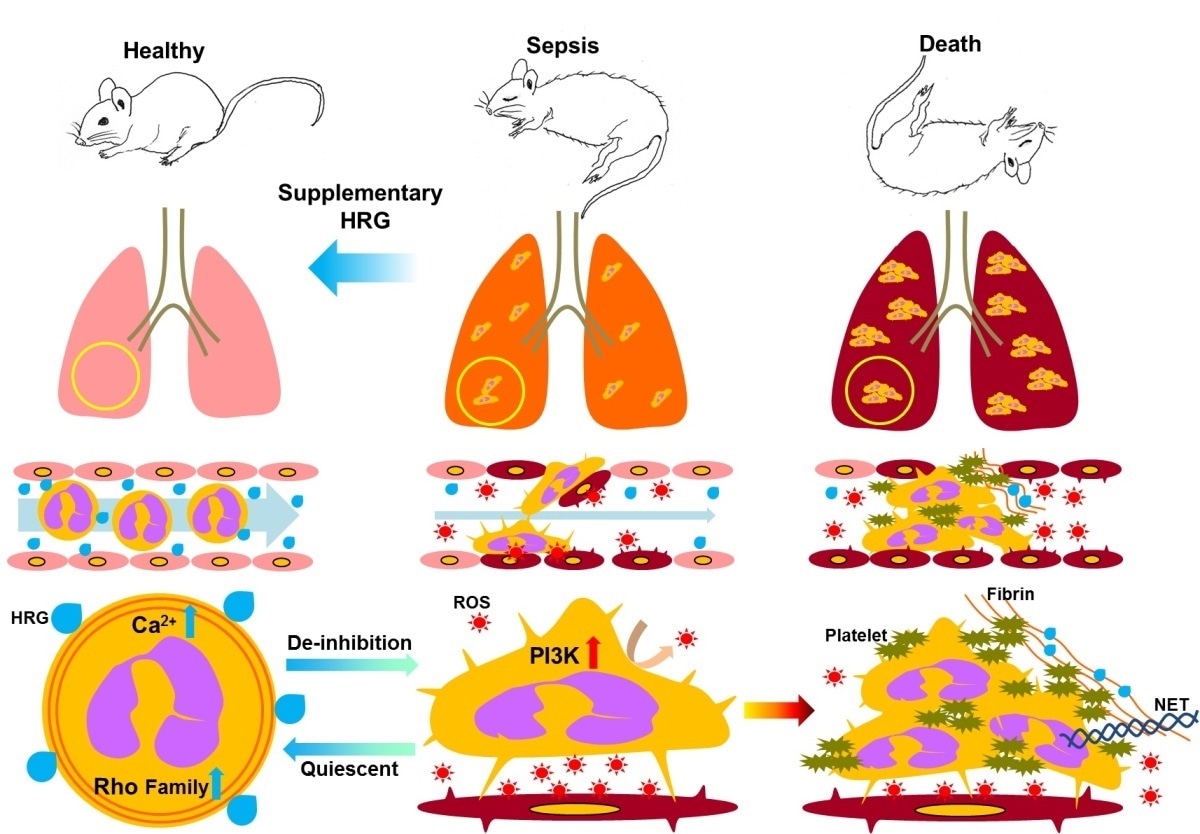 The researchers found that the HRG mice quickly regained locomotor activity, and began to recover from sepsis. Further investigations showed that the mice exhibited far less inflammation in the lungs than their non-treated counterparts. Neutrophils in the HRG mice were smooth and spherical in shape, allowing them to flow freely through microcapillaries and veins. The septic mice, however, had deformed neutrophils with irregular shapes. This in turn triggered unwanted activity because the deformed neutrophils became attached to other cells, creating cell clusters that limited blood flow.
