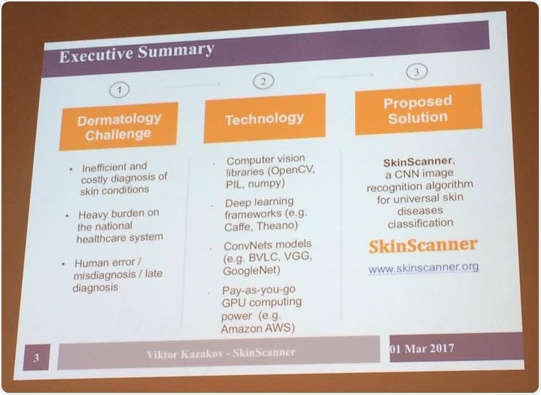 Viktor Kazakov introduced Skin Scanner – a convolutional neural network algorithm that can classify patients' skin diseases. Patients can submit a picture of an area of skin that is troubling them, then the system will visually scan it to match it to one of 23 skin disease classes that it has learned to recognize. The system has been shown to classify 67% of images by the correct disease category.