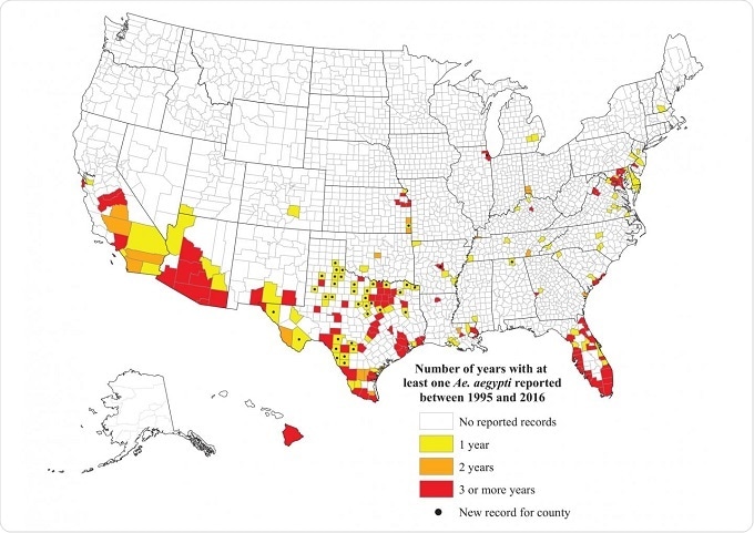 In 2015, a survey of vector-control professionals, entomologists, and state and local health departments was conducted at county level and another survey was carried out in 2016. CDC has compiled the county-level records that show the distribution of Ae. Aegypti in 220 counties across 28 states and the District of Columbia (DC), and Ae.Albopictus in 1368 counties across 40 states and in the DC. The CDC researchers said that the data collected was their best knowledge regarding the distribution of Ae. aegypti and Ae. albopictus across the U.S. during the period 1995–2016.