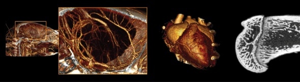 Left: U-CT image of mouse brain vasculature. Middle: Dual-gated cardiac CT. Right: U-CT rat knee
