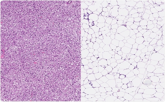 Image: (Left): Normal healthy brown fat (left image) and normal healthy white fat. Brown adipose tissue or hibernating gland with small fat vacuoles. (Right): White adipose tissue with large fat vacuoles ©vetpathologist