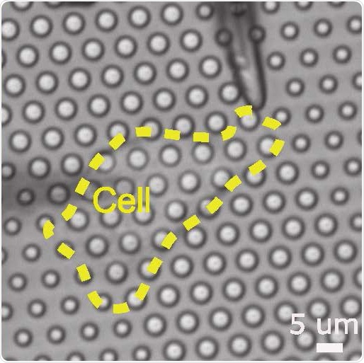 Kleindiek MM3A-LM manipulator tip (top) precisely “poking” a pillar array (light circles) to stimulate a cell.
