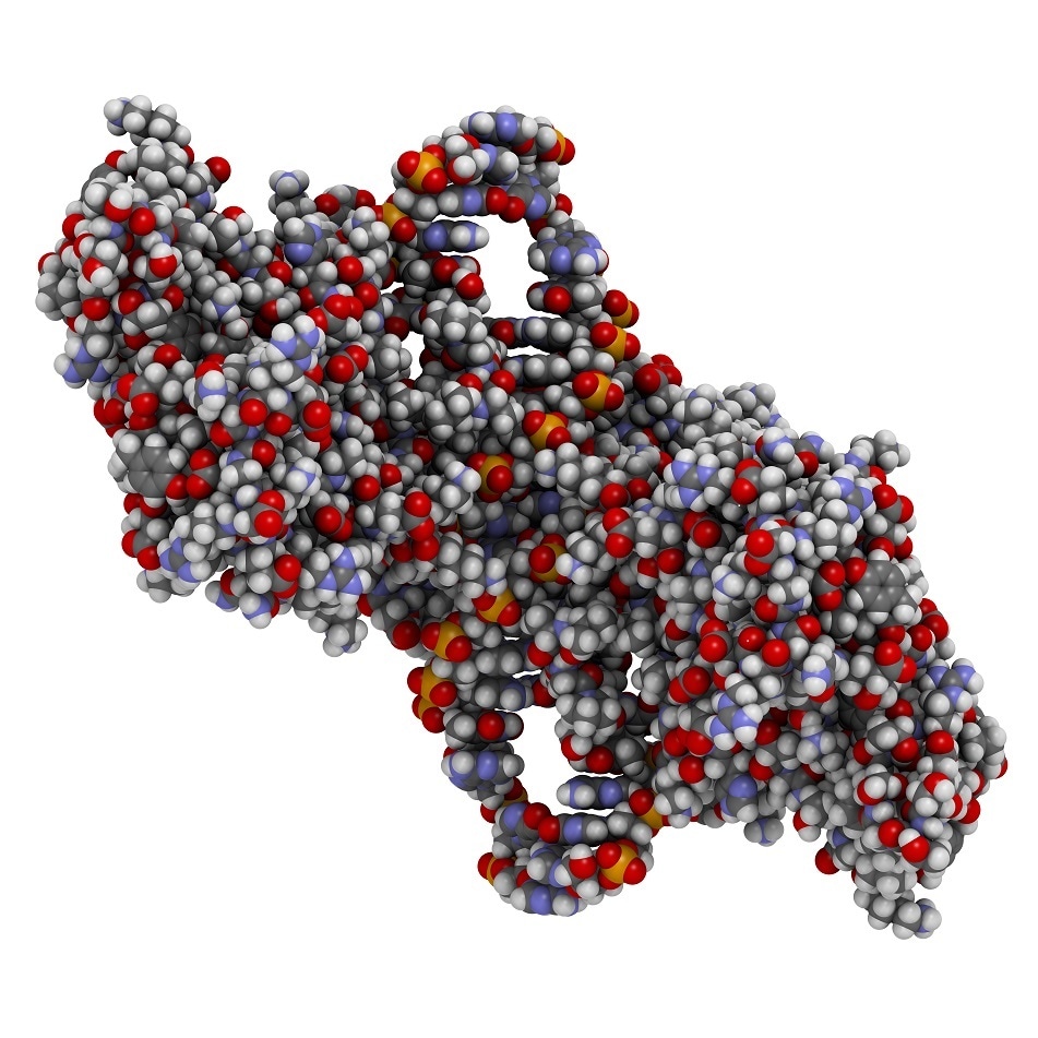 NF-kB (nuclear factor kappa-light-chain-enhancer of activated B cells) protein complex. Plays a role in cancer and inflammation. Atoms are represented as spheres with conventional color coding. Credit: molekuul_be/ Shutterstock.com