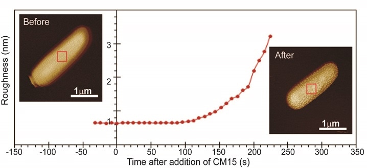 Top: high lateral resolution on living bacteria in saline buffer solution. Bottom: time lapse resolved action of peptide disrupting bacteria membrane