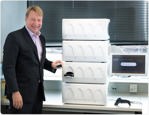 Tuomas Tenkanen (Mobidiag CEO) and the fully automated Novodiag® system