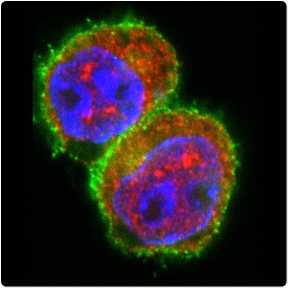 T cells after stimulation in the presence of a miRNA181a mimic. Immunofluorescent staining of the T cell marker CD4 (green), the transcription factor NFAT5 (red) and the nucleus (blue). The stimulation in the presence of a miRNA181a mimics results in an increase of NFAT5 expression in T cells. Source: Helmholtz Zentrum München